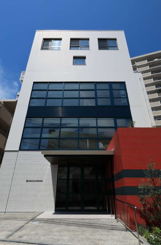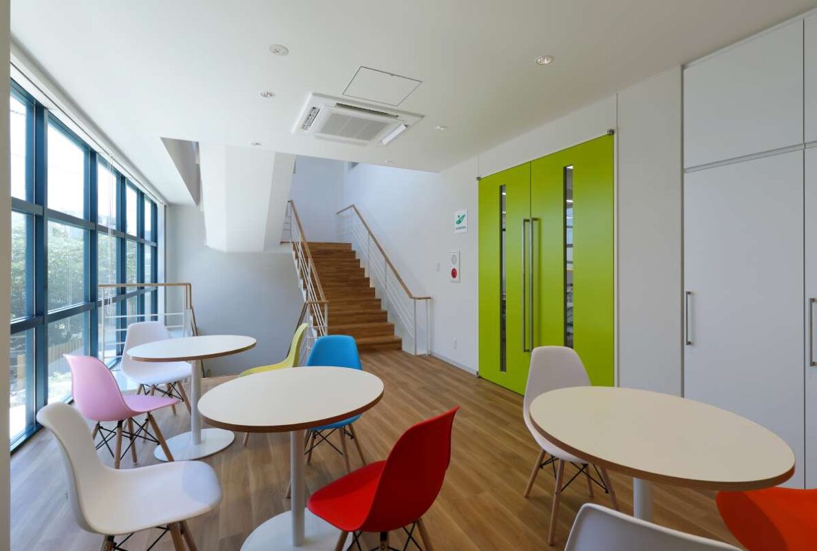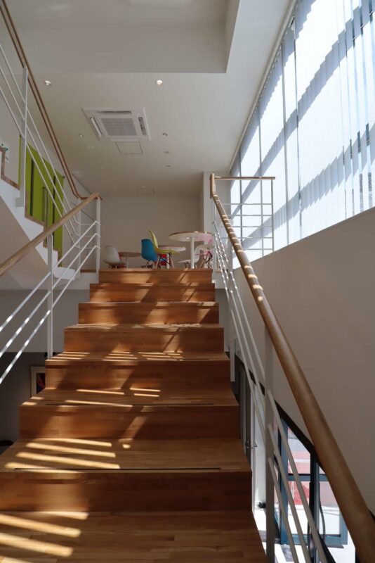 2階は普通教室で座学のスペース、教室前のホールを学生の憩いの場に設定した。